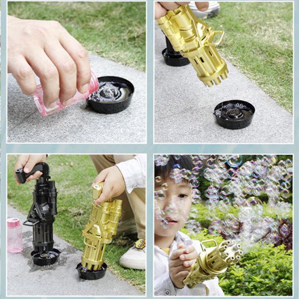 Foarte ușor de utilizat, trebuie doar să introduceți bateriile, să reîncărcați rezervorul cu lichid, să apăsați trăgaciul și să vă distrați formând baloane de săpun