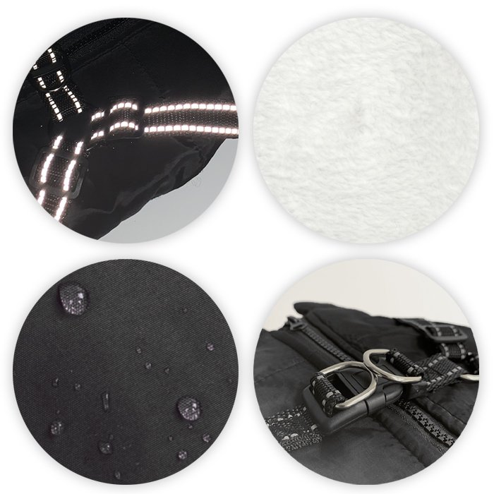 Designul de bavetă de pe spate este reflectorizant și reglabil, îl puteți conecta cu diferite lese pentru câini. Nu trebuie să cumpărați paltoane și bavete separat, deoarece haina noastră pentru câine le oferă ambele. În ciuda hainei bine acoperite, câinii nu vor fi împiedicați atunci când vor să se ușureze și să îndeplinească o nevoie.