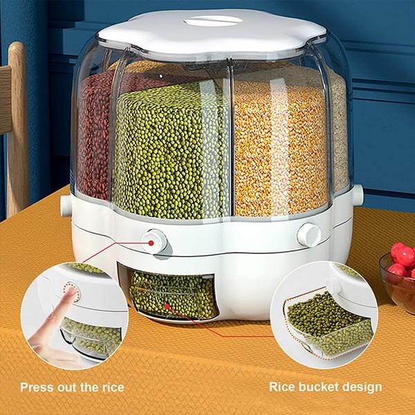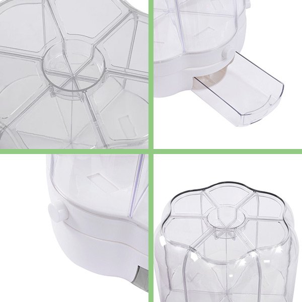 Fie că depozitați alimente uscate, resturi sau gustări, containerul nostru de depozitare a alimentelor cu rotație asigură acces ușor și organizare fără probleme, devenind o adiție indispensabilă în orice bucătărie.