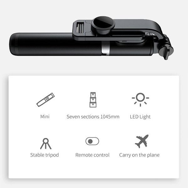 Trepiedul Selfie Stick se transformă cu ușurință într-un selfie stick sau într-un suport pentru smartphone-ul tău cu telecomandă fără fir. Suportul este compact și pliabil pentru o portabilitate ușoară. În plus, există și o lumină încorporată care luminează elementele dorite.