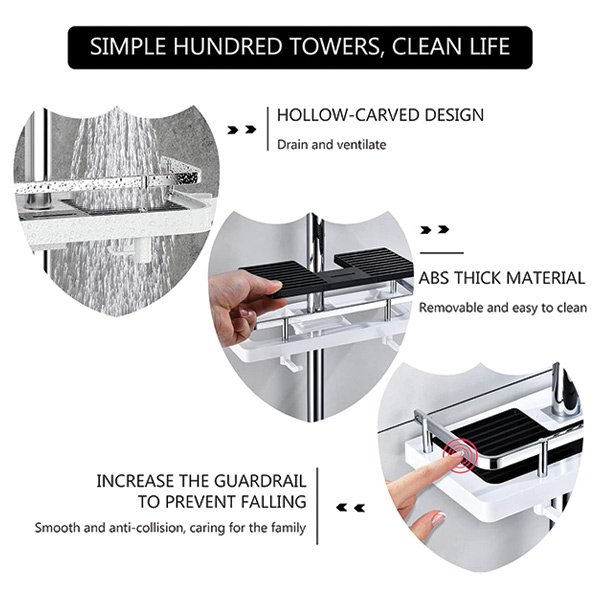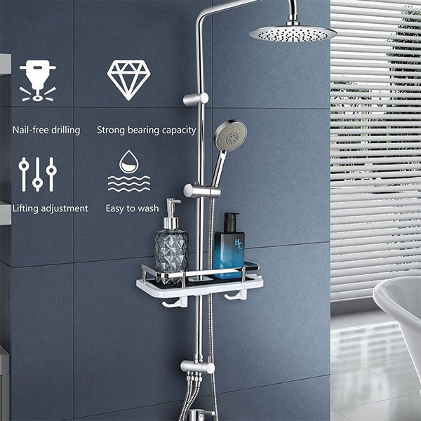 Cu mai multe rafturi reglabile și cârlige, Showy oferă spațiu amplu de depozitare pentru a menține obiectele esențiale de duș la îndemână. Spuneți adio să ajungeți după șampon de pe podea!